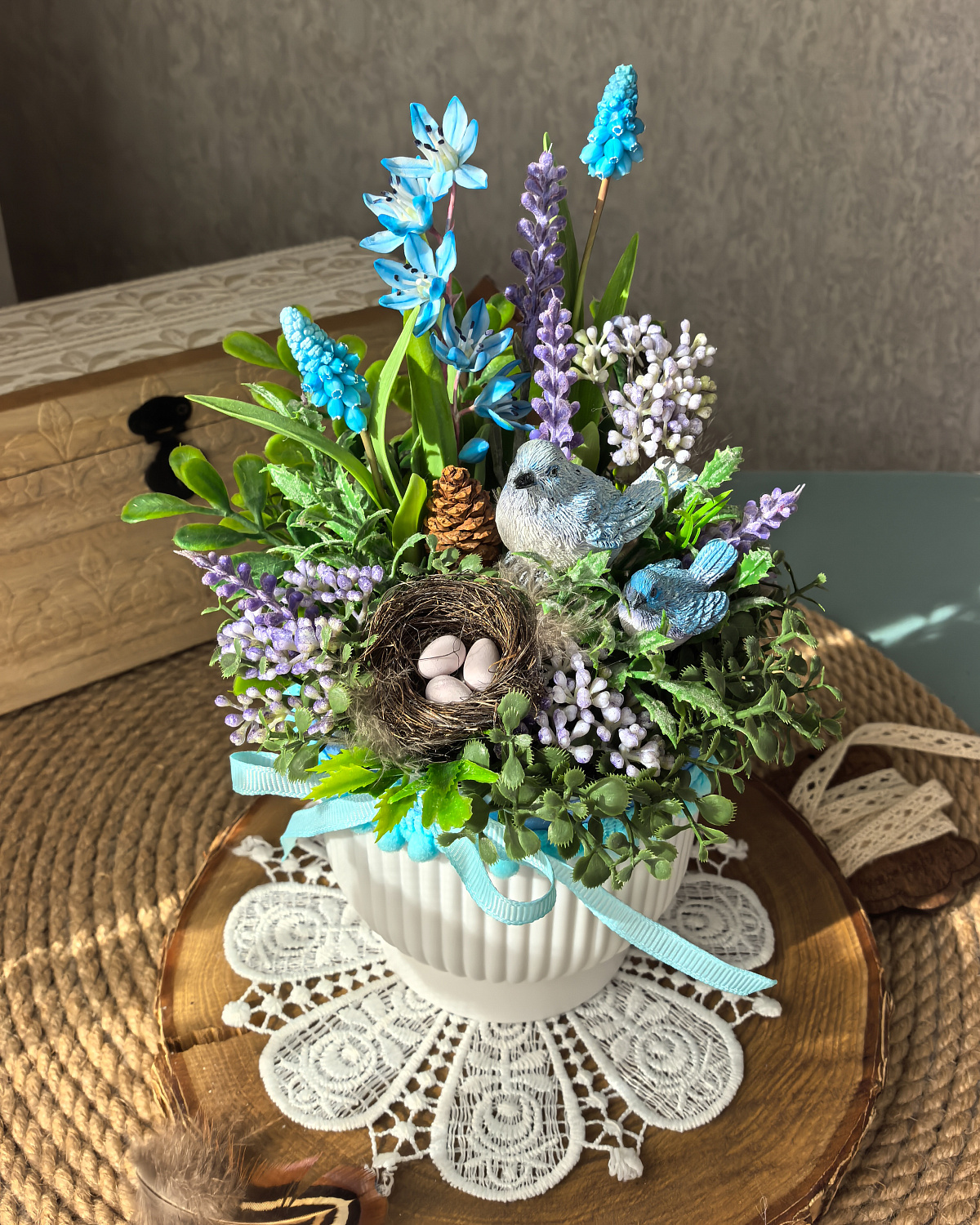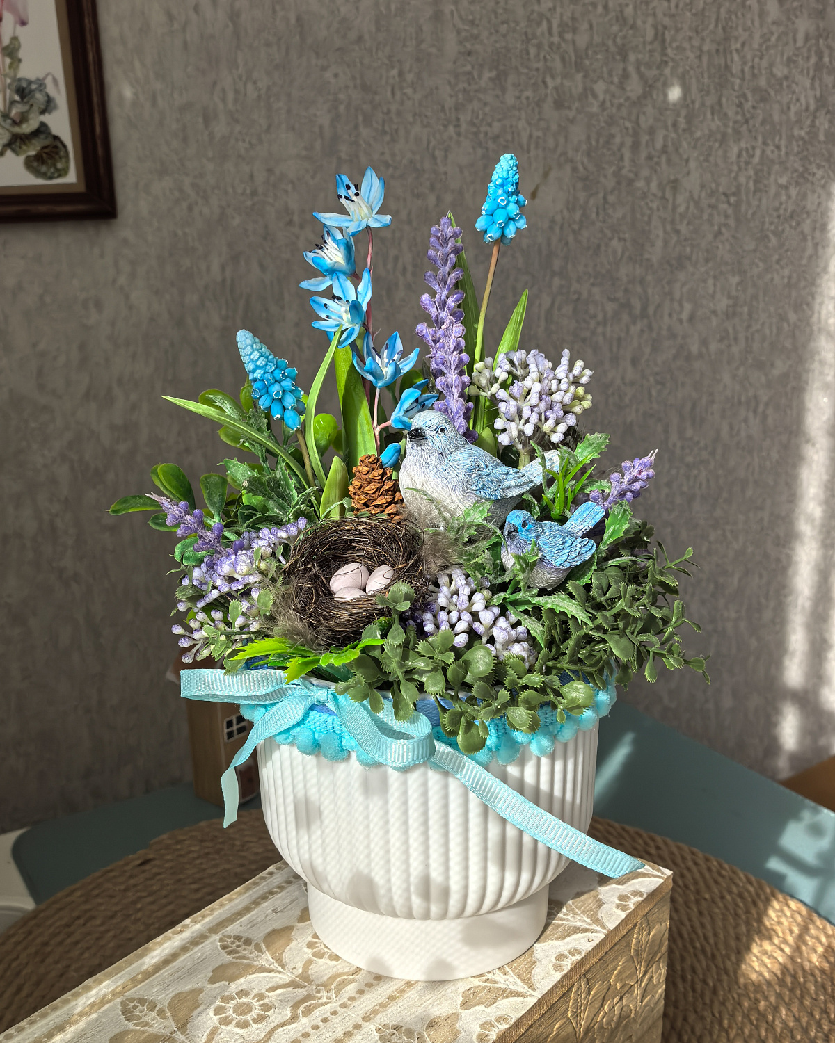 В композиции использовано много разнообразной зелени, цветы из полимерной глины. Дополняют композицию фигурки птичек, и уютное гнездышко.