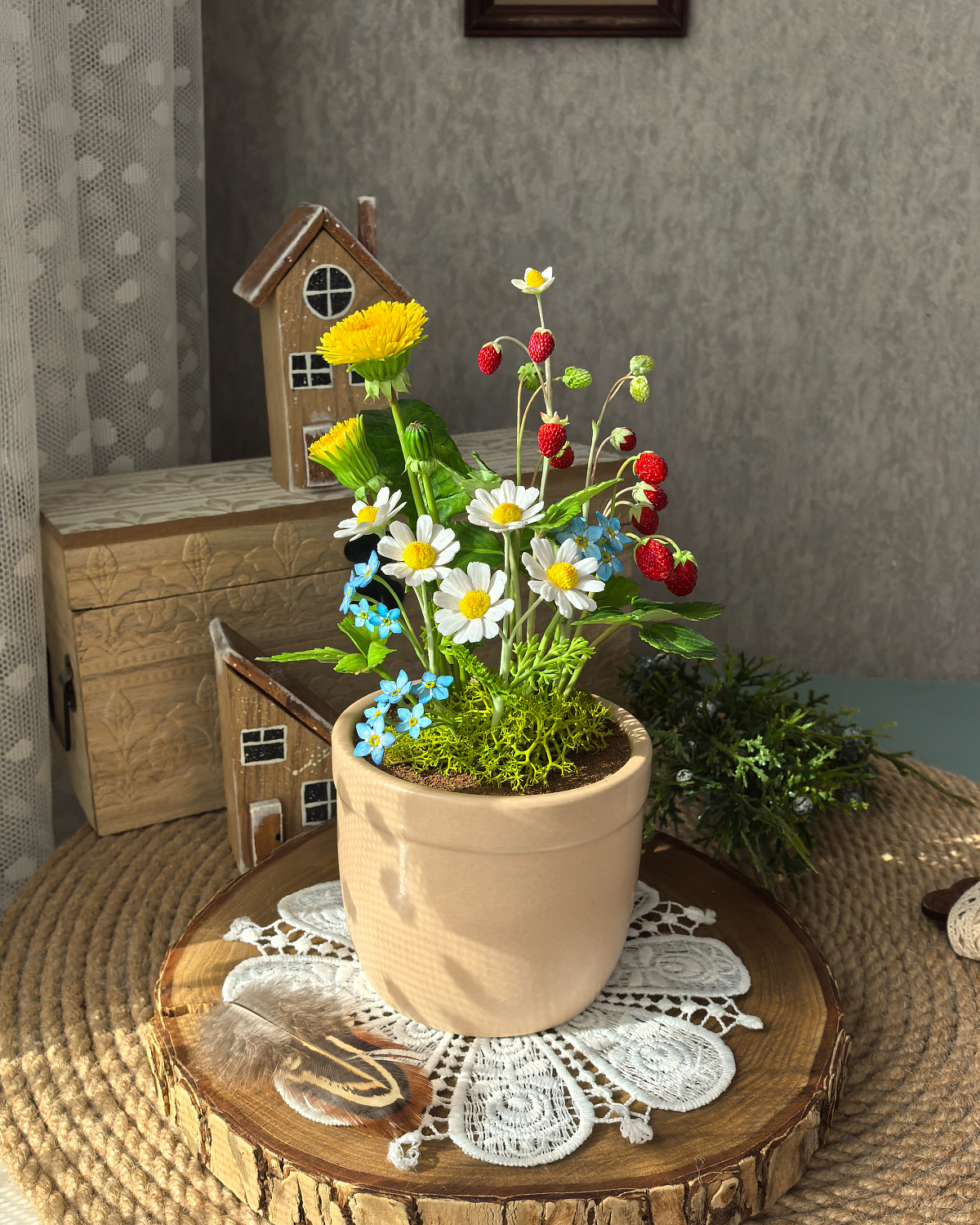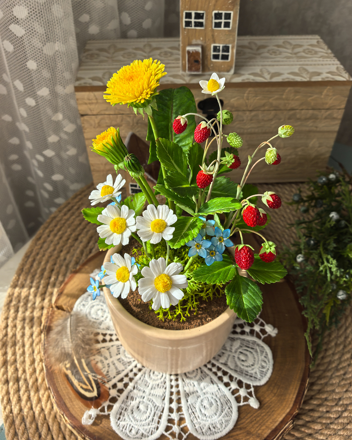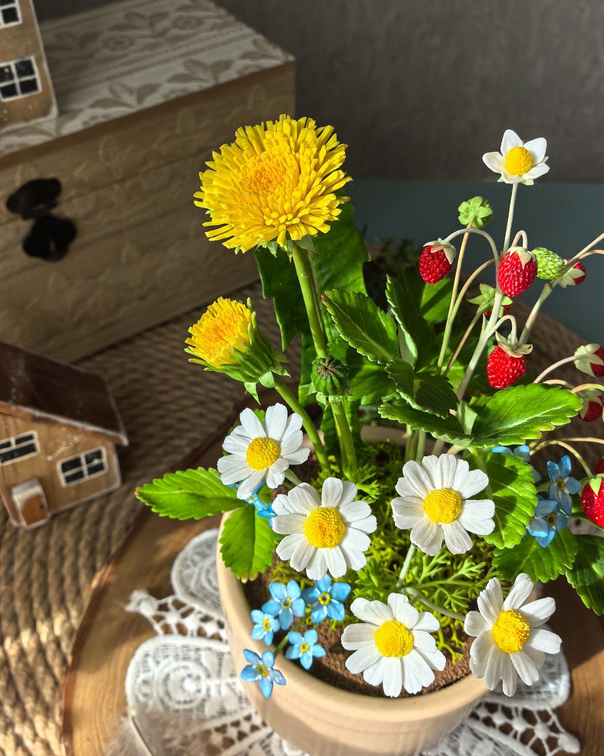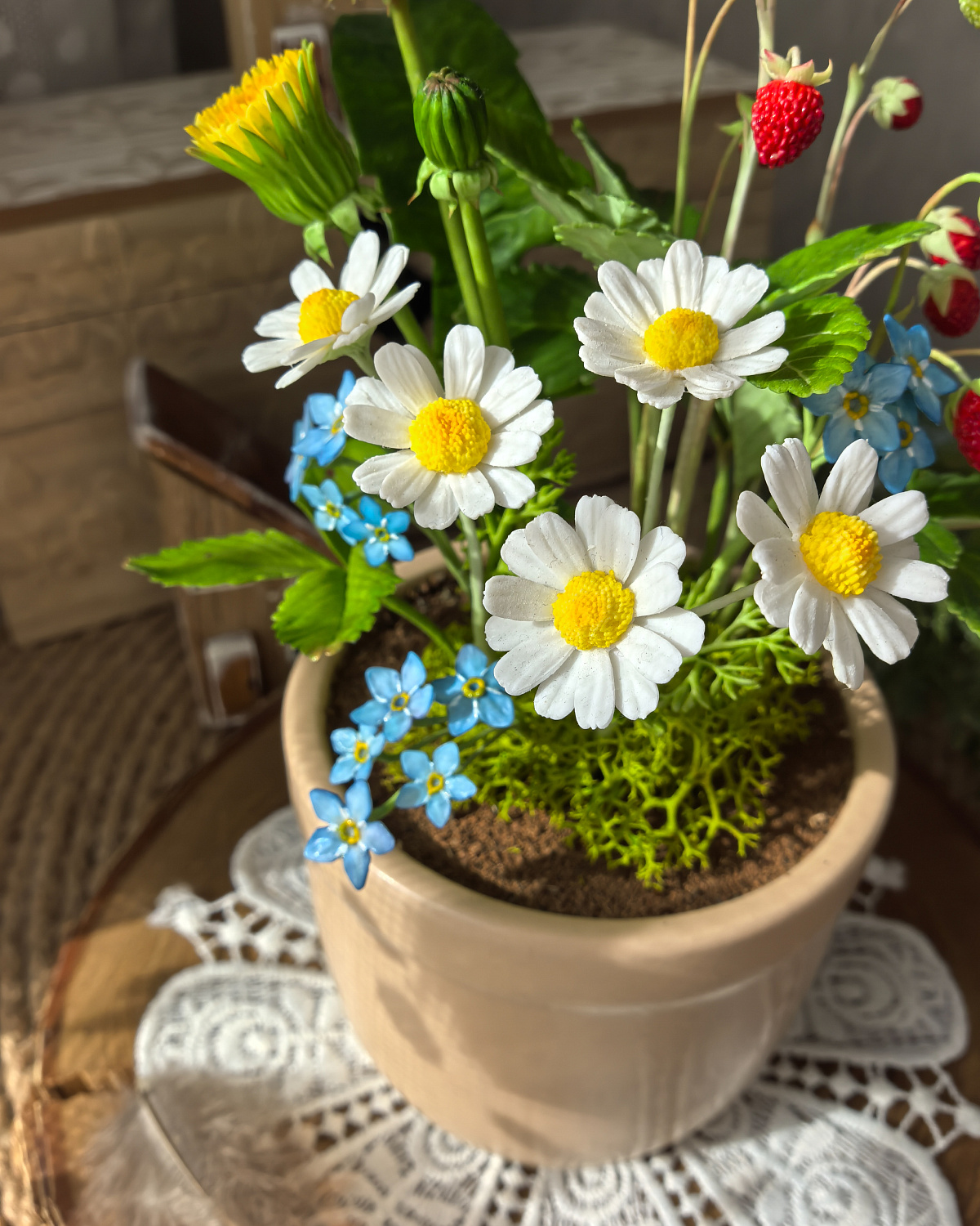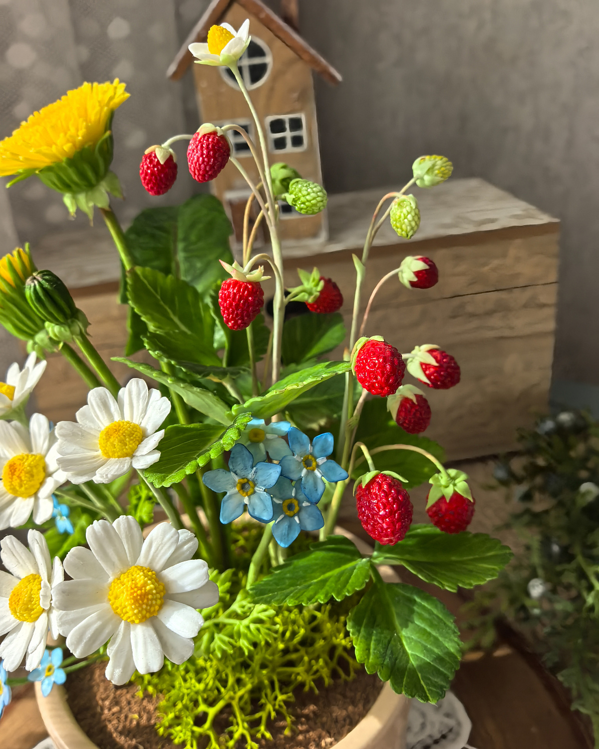 Композиция из земляники, ромашек, незабудок и одуванчиков окрашены масляными красками и сухой пастелью.