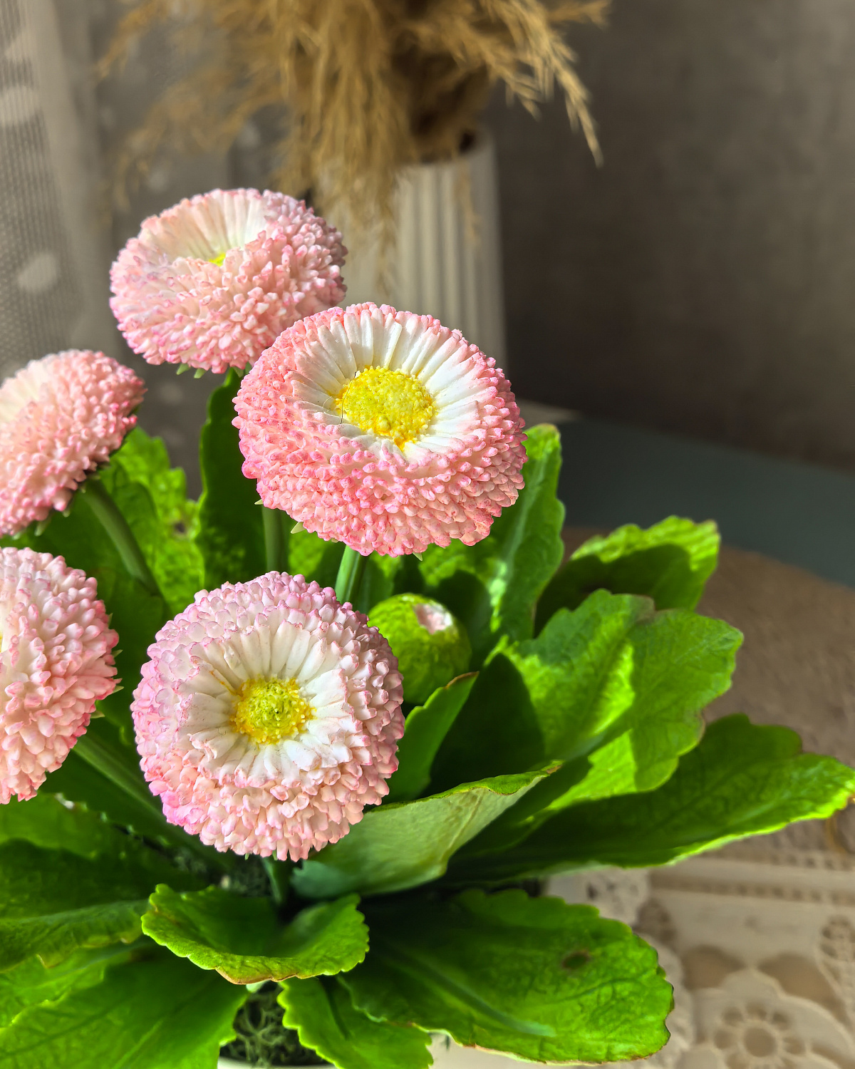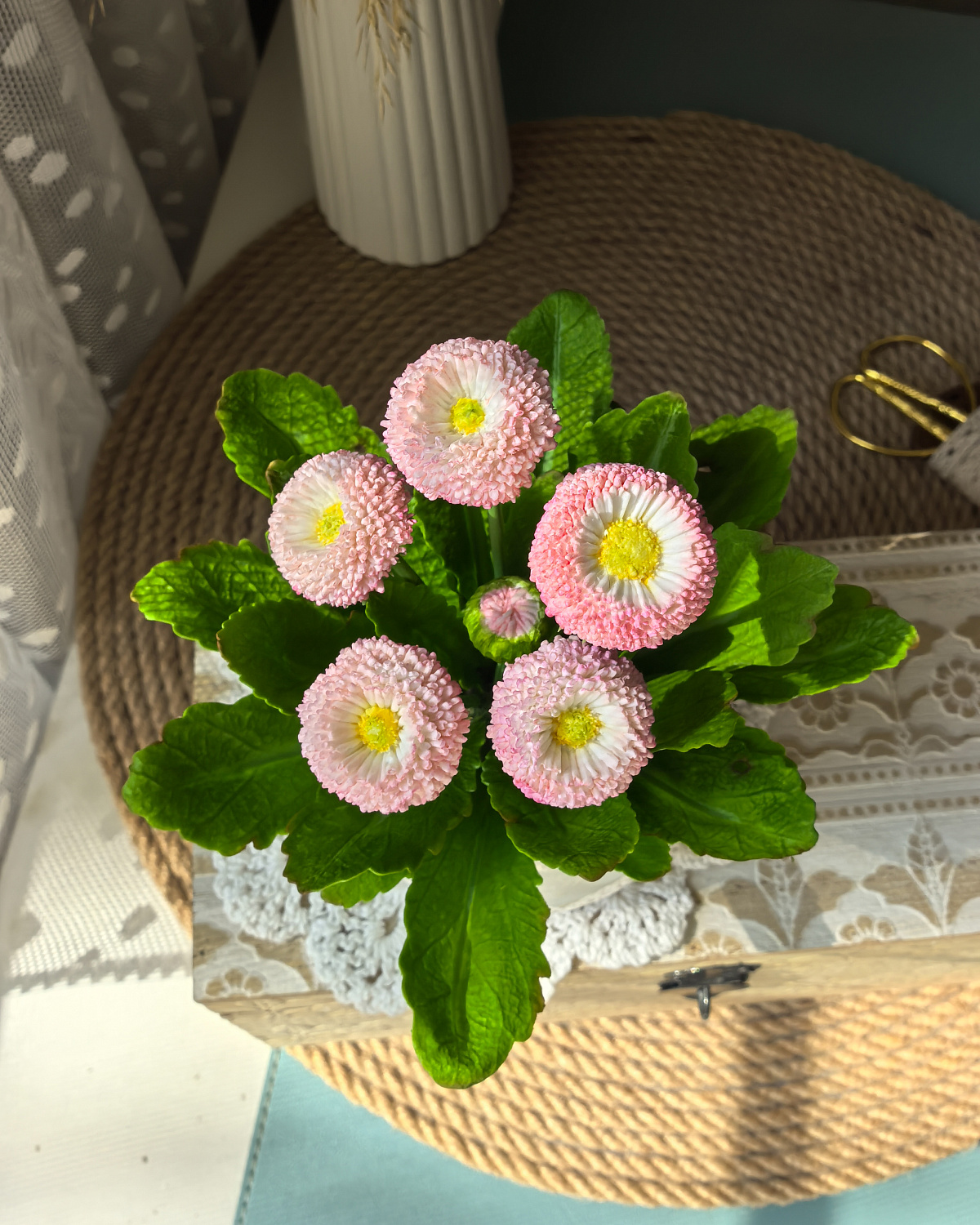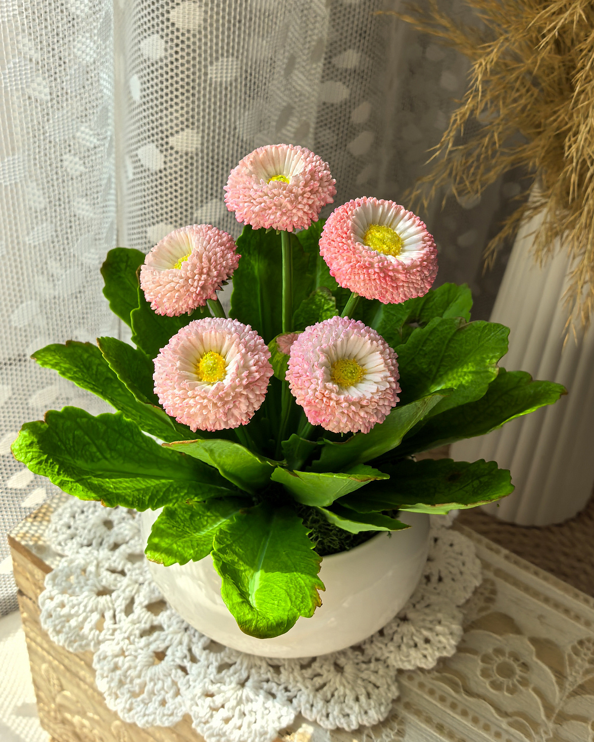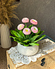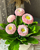 Миниатюрная - розовая семейка маргариток высажена в керамический горшочек.