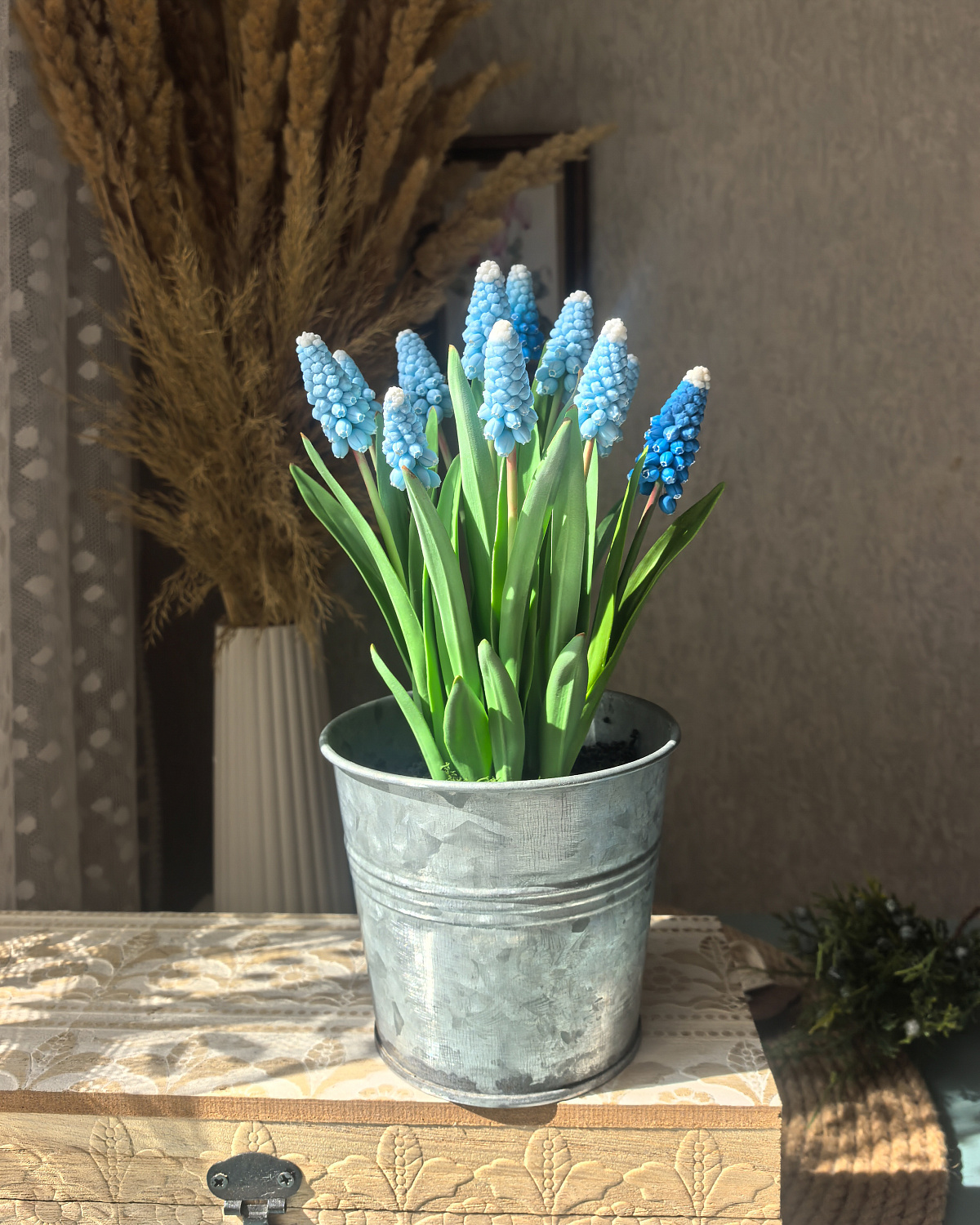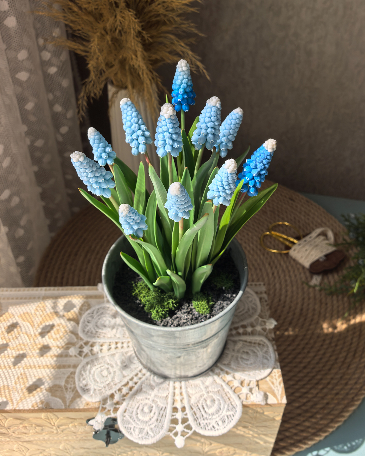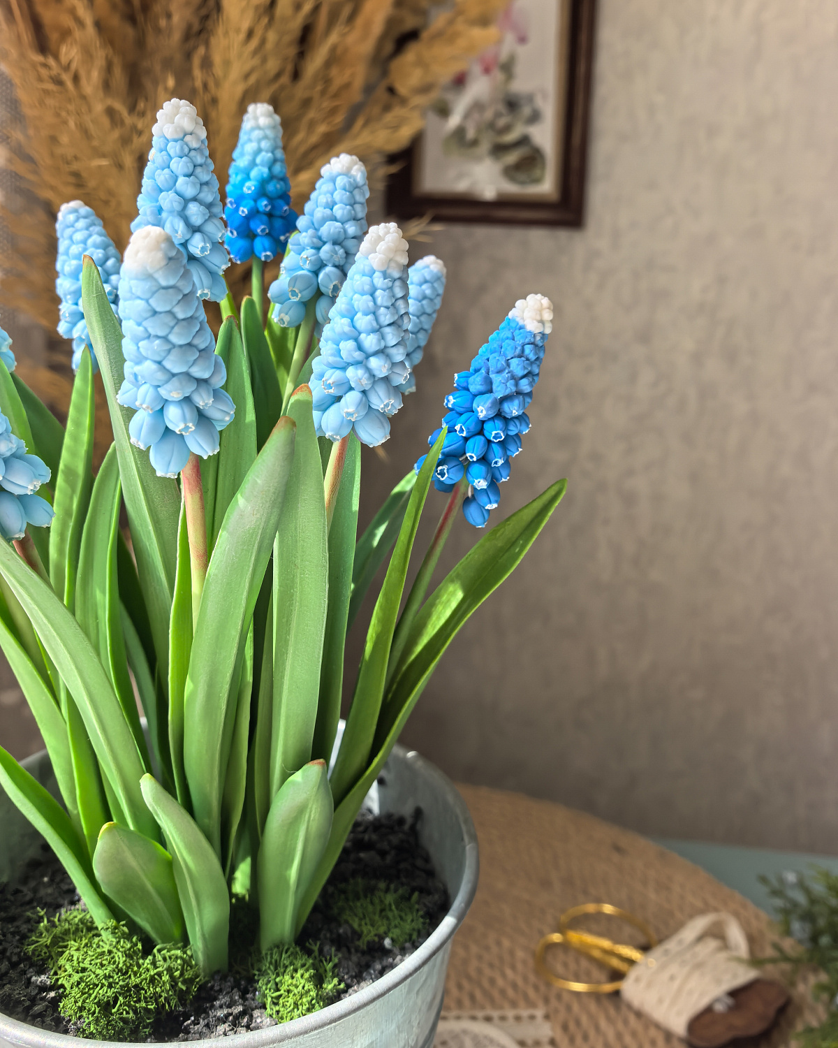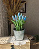 Мускари выполнены из холодного фарфора. Композиция состоит из 11 мускари голубого и синего цвета.