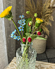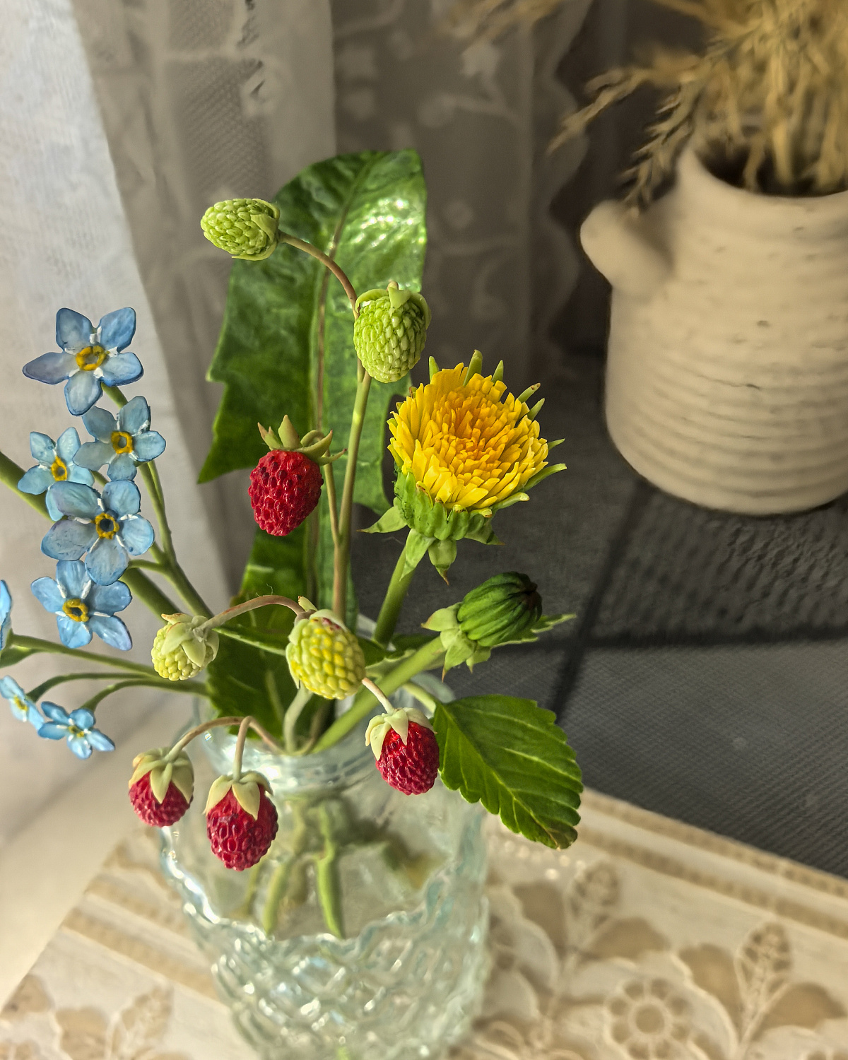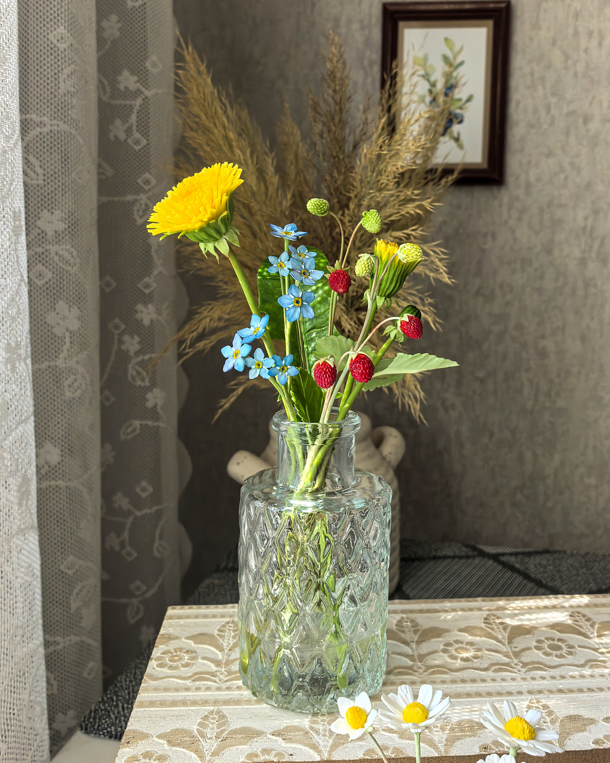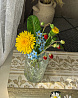 Композиция из земляники, одуванчиков и незабудок окрашены масляными красками и сухой пастелью. Надёжно закреплены в вазе с имитацией воды.