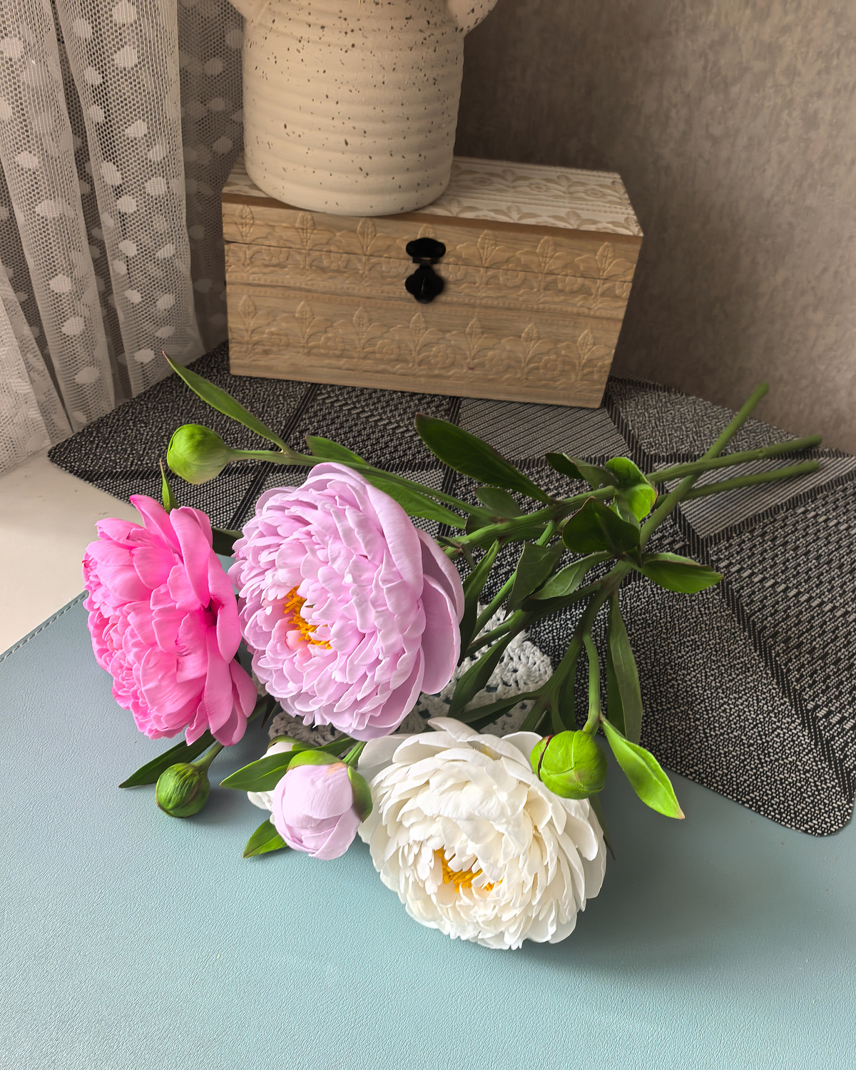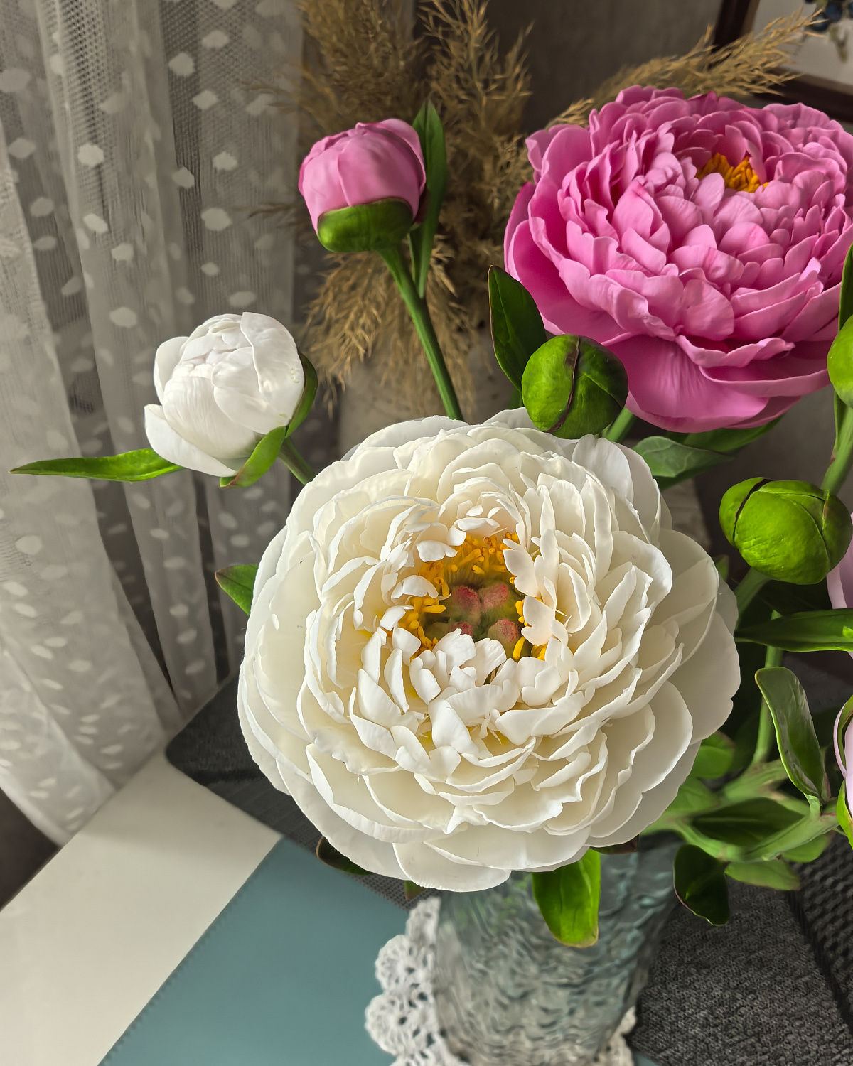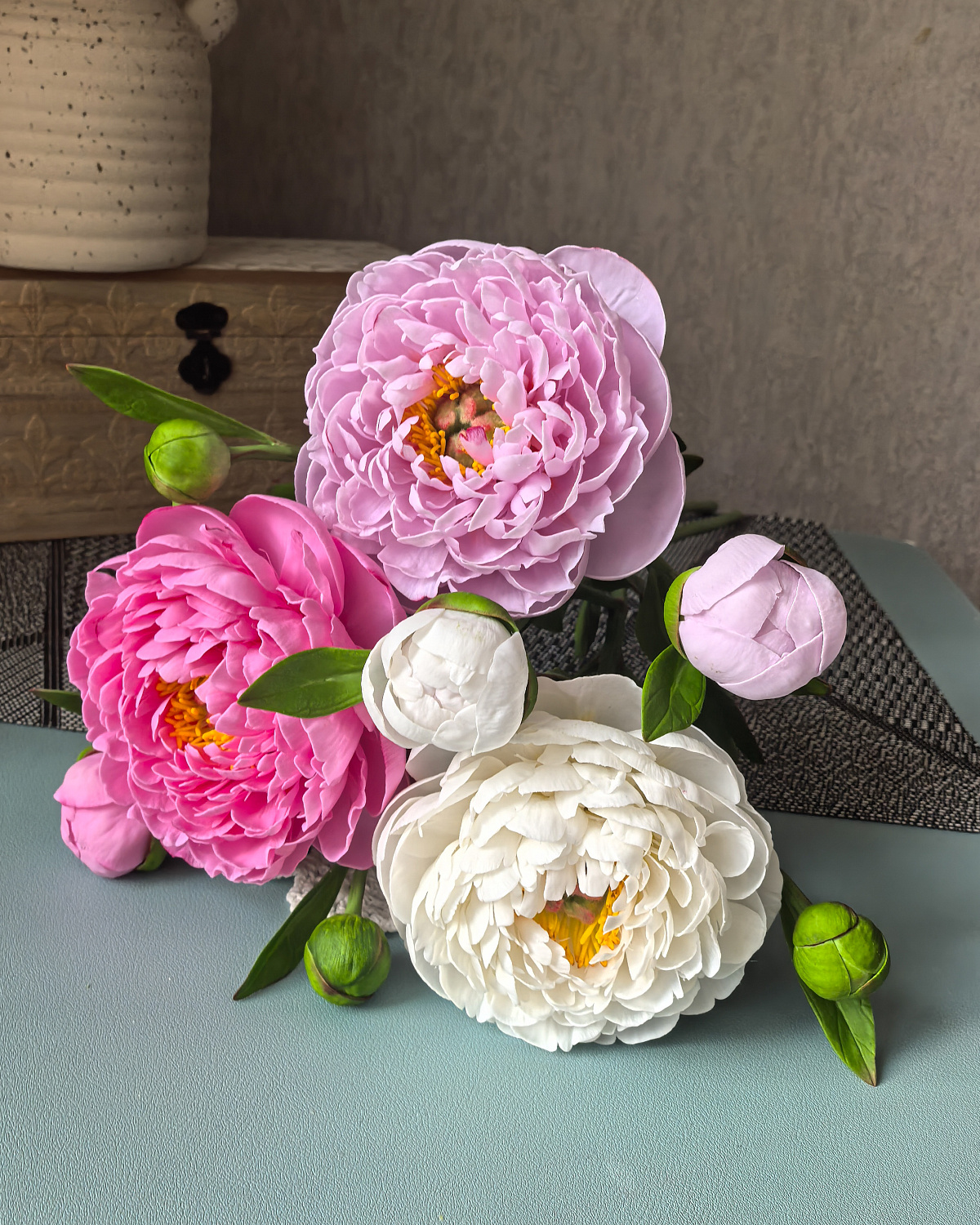 Пионы выполнены из холодного фарфора, слеплены полностью вручную, лепесток за лепестком. Окрашены масляными красками и сухой пастелью. Цветы немного гнутся, не хрупкие, прекрасно переносят пересылку.