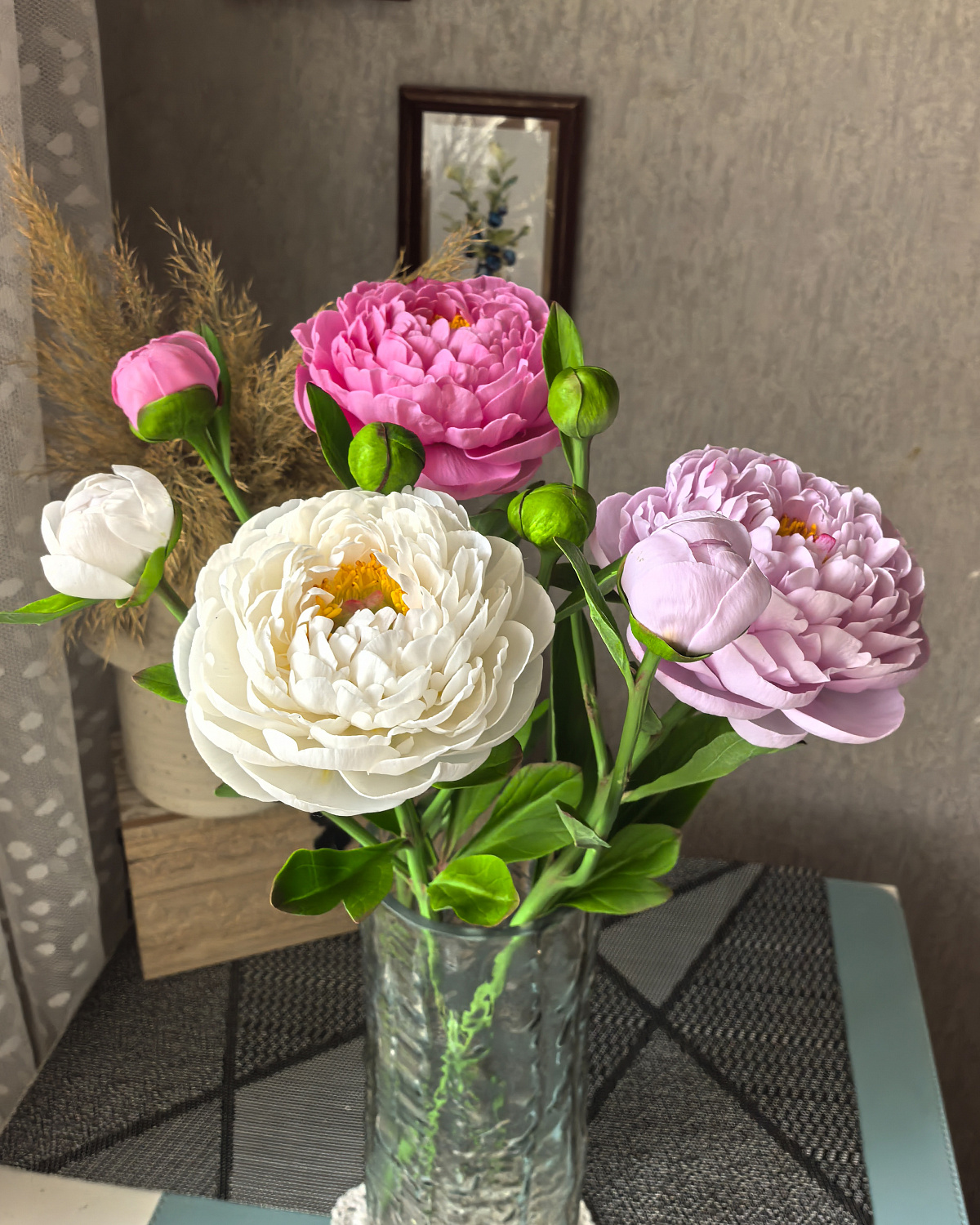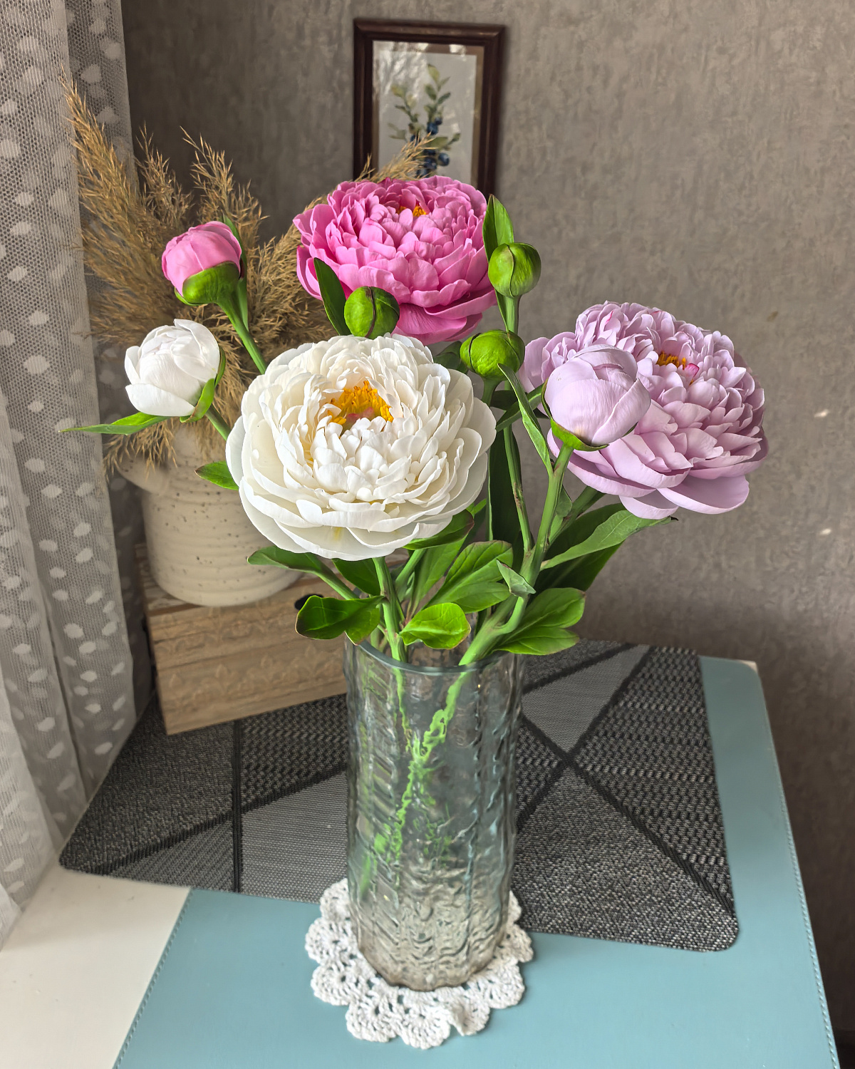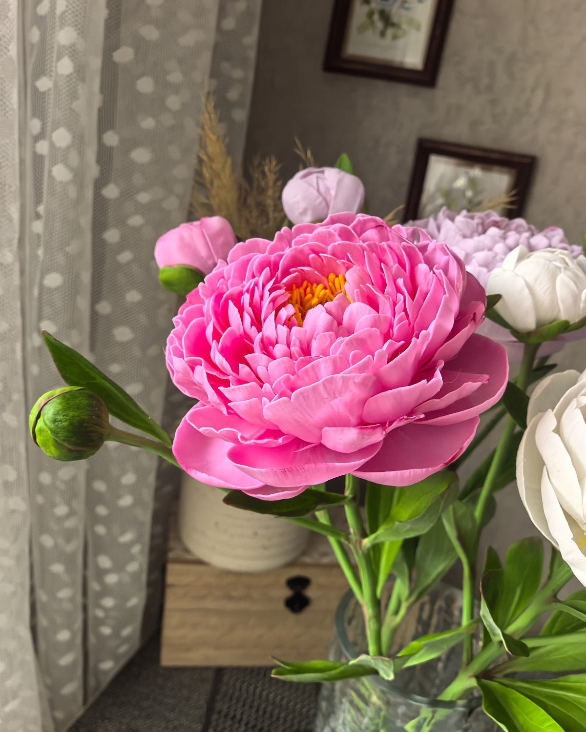 Пионы выполнены из холодного фарфора, слеплены полностью вручную, лепесток за лепестком. Окрашены масляными красками и сухой пастелью. Цветы немного гнутся, не хрупкие, прекрасно переносят пересылку.